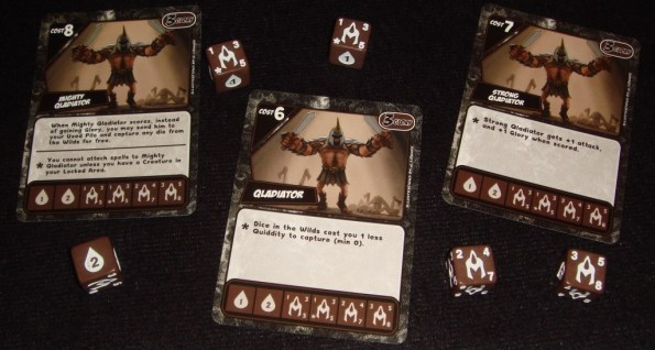 Qladiator. Одно свойство даёт возможность вместо очков славы взять бесплатно любой кубик из леса, другое (на звёздочке) позволяет покупать кубики на 1 сущность дешевле, а третье (на звёздочке) даёт +1 атаку и +1 славу.