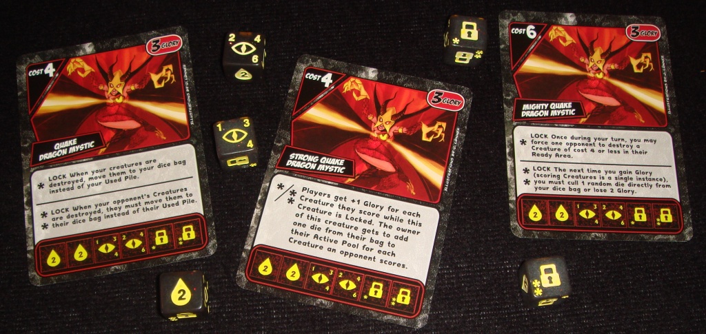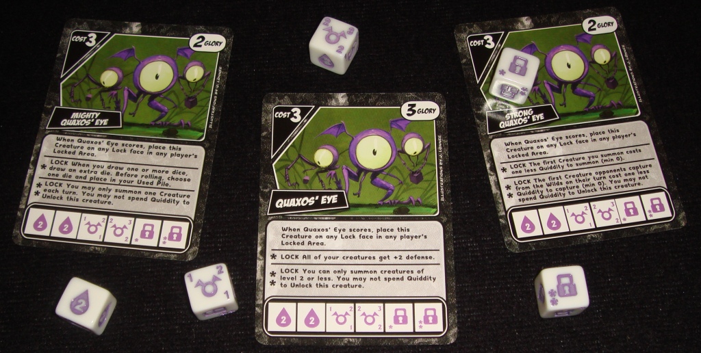 Теперь в зоне боя (Ready Area) появилось место для одного залоченного кубика. Если игрок выбрасывает хотя бы один замок, то он обязан поместить его на это специальное место, после чего сразу же вступает в силу эффект существа.