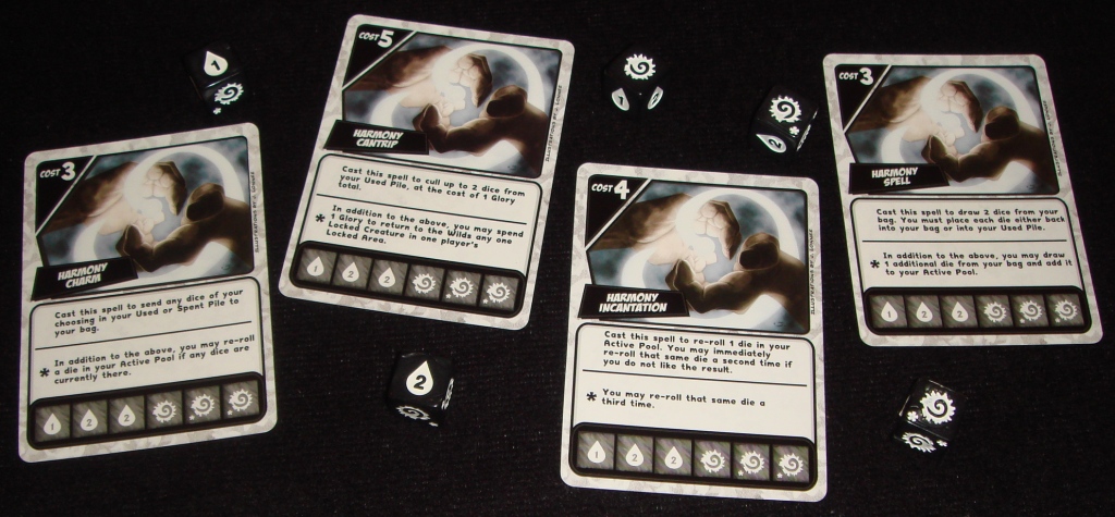 Заклинание Гармонии. За очко славы возвращает в лес залоченные кубики соперников, позволяет класть использованные кубики обратно в мешок или делать перебросы.