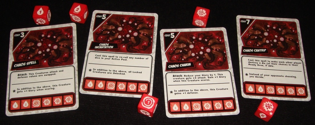 Заклинание Хаоса. Заставляет каждого соперника уничтожить 1 кубик в зоне боя, за очко славы увеличивает атаку существа на 3, меняет местами значения атаки и защиты или разлочивает все кубики.