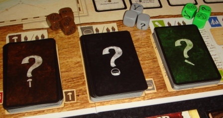1. Фаза событий. В начале каждого раунда из колоды событий тянется карта, текст которой разбит на две части. Сверху описан эффект, который разыгрывается немедленно, и нарисована одна из двух возможных иконок – цветной вопрос или книжечка. Вопрос означает, что при выполнении действия указанного цвета (собирательства/исследования/строительства) игрокам не удастся избежать карты приключений. Эффект книжечки обуславливается сценарием.