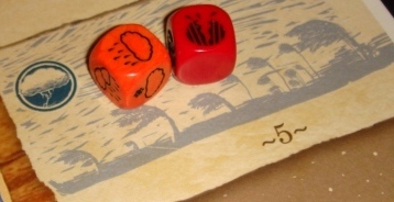 5. Фаза погоды. Самая противная фаза, во время которой мы чаще всего надеемся на авось, а потом кусаем локти. В каждом сценарии описано, в каком раунде и какие кубики погоды следует кидать. Кубика три: один с дождём, второй со снегом и третий с голодными животными. На кубиках погоды следует опасаться тучек, число которых сравнивается с уровнем крыши укрытия. Если крыша хилая, то лагерь заливает, и за каждую лишнюю тучку команде нужно скинуть одно дерево и одну еду. На зимнем кубе берутся во внимания ещё и снежинки. За каждую снежинку команде нужно греться, т.е. без вариантов нужно скинуть одно дерево. Кубик голодных зверей имеет три разных последствия: первое – зверь с силой 3 может напасть на лагерь, и с ним тут же нужно сразиться; второе – зверь может поломать частокол, тогда его уровень нужно снизить на 1, и третье – зверь может позариться на запасы провизии, в таком случае необходимо скинуть 1 еду. В общем, фаза погоды – зло, особенно, когда кидаются все три кубика, и когда знаешь, что на каждом из них есть по паре соблазнительных пустых граней.