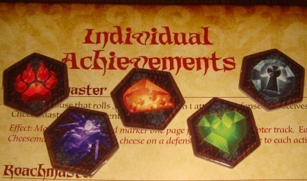 Кроме карт навыков, в игре также есть жетоны личных достижений, их можно использовать в партиях по желанию. Личные достижения вручаются мышатам по ходу сценария за некоторые подвиги или, наоборот, неудачи. Например, убив четырёх тараканов во время одной карты контакта, герой становится Roachmaster-ом. Кроме самого жетона, мышонок получает и дополнительную способность, но самое главное, что некоторые достижения продлевают время для выполнения миссии, двигая маркер конца партии дальше по треку.