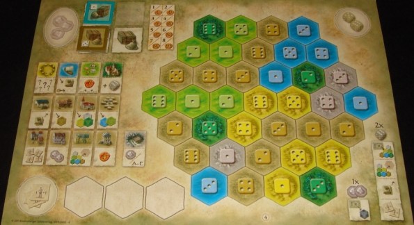 Но, как говорится, не будем встречать по одёжке, а посмотрим, какова же начинка. Игра в первую очередь интересна тем, что в ней представлена очередная достаточно необычная идея применения простых шестигранных кубиков. С помощью них тут не просто выбираешь ресурс (как в Кингсбурге), но ещё строишь и торгуешь.