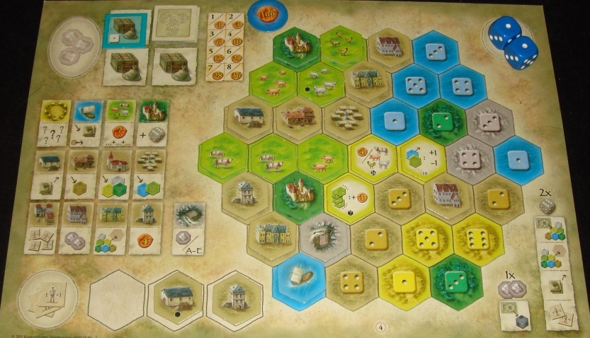 Но, как говорится, не будем встречать по одёжке, а посмотрим, какова же начинка. Игра в первую очередь интересна тем, что в ней представлена очередная достаточно необычная идея применения простых шестигранных кубиков. С помощью них тут не просто выбираешь ресурс (как в Кингсбурге), но ещё строишь и торгуешь.