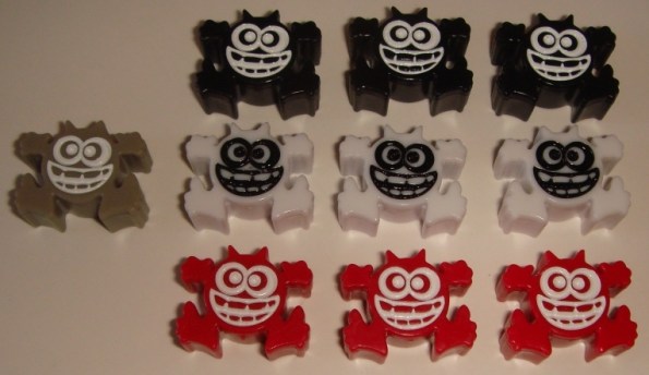 Суть игры такова. Сперва на стол высыпаются дьяволята. При игре вдвоём или втроём чёрных, белых и красных дьяволят должно быть на одного меньше, чем игроков. Далее каждому выдаётся по 5 кристаллов, они тут являются счётчиками неудачных попыток… хватания. Да, вы не ослышались, в Diavolo мы будем кидать кубики, проводить простейшие калькуляции и хватать нужных бесят!