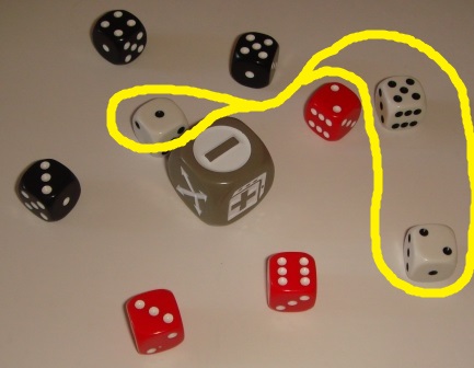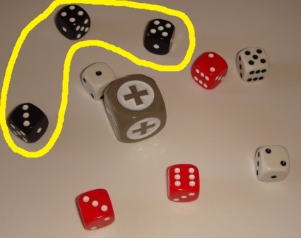 Если выпал плюс или минус, то сравнивается сумма точек в каждой группе кубиков одного цвета. При плюсе определяется наибольшая сумма…
