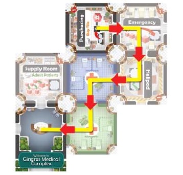 1. Принять пациентов. Кубики-пациенты, ожидающие в очереди, раскладываются по палатам соответствующих цветов при условии, что в них нет карантина, то есть серых кубиков заразы, при этом каждая палата может принять только одного пациента. Кубики “заходят” в больницу строго по порядку, и если очередь доходит до больного, которого негде принять (не осталось или вообще нет комнаты нужного цвета), то игроку нужно что-то придумать, чтобы возобновить приём. Для этого и пригодятся другие действия.