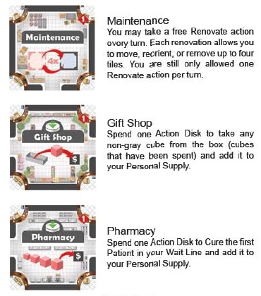 4. Купить и пристроить комнату. Как я уже писал выше, специальные тайлы можно купить как с рынка, так и из стопок, находящихся перед другими игроками, единственное условие – контракт. Специальные комнаты не принимают пациентов, но дают определённые бонусы: улучшают обычные действия или открывают новые. Например: кафетерий приносит в начале каждого хода по одному дополнительному действию, а в комнате экстренной помощи можно принять одного пациента, как только он тянется из мешка, то есть вне очереди.