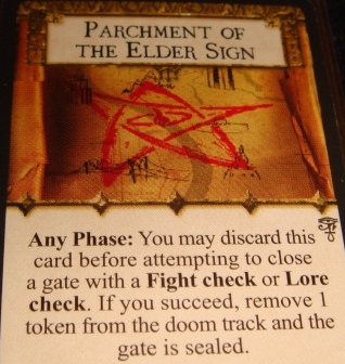 Карты экспонатов. Это карты выставочных предметов, они представляют собой различные древние египетские статуэтки, книги и маски. В принципе, это те же уникальные предметы, только их нельзя купить. Получить их можно во время контакта в Аркхэме и в Других мирах. Из всех предметов больше всего мне запомнился Parchment of the Elder Sign, позволяющий в случае успеха при закрытии врат снять со шкалы Древнего один жетон пробуждения (аналог обычного Elder Sign, не требующий траты жетонов здоровья и психики).
