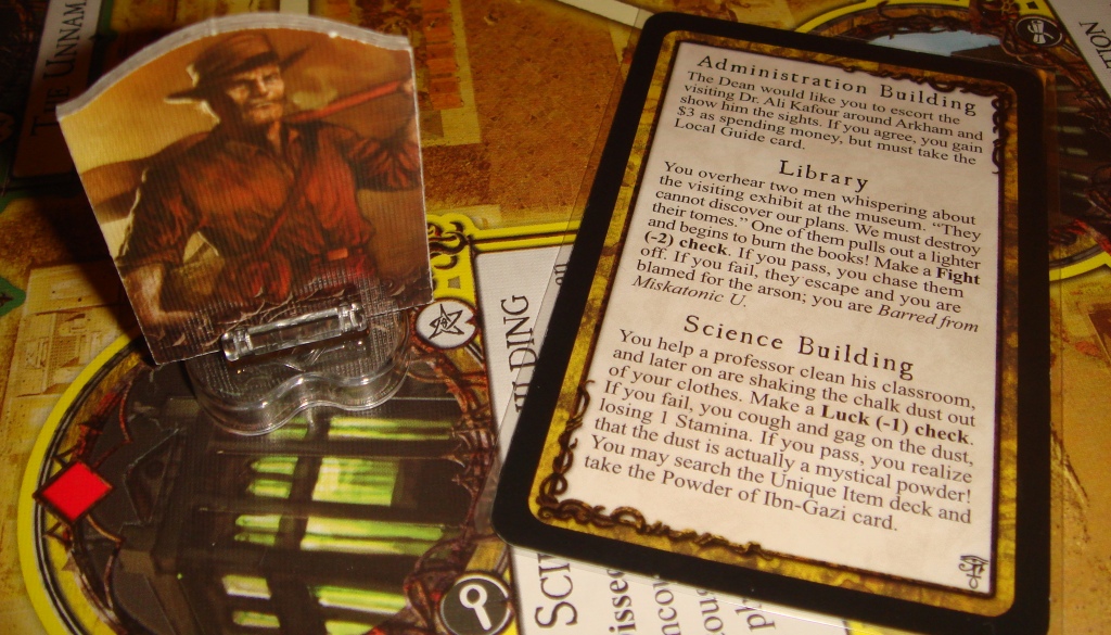 Жетон шёпота времени и музейные контакты. Шёпот времени изначально доносится из Мискатоникского университета, во время подготовки жетон кладётся именно туда. Оказавшись на локации с жетоном шёпота, исследователь берёт карту из колоды музейных контактов и разыгрывает её эффект. Карты музейных контактов позволяют разжиться на экспонаты и отвечают за перемещение жетона по городу.