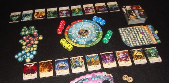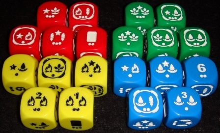 После распределения кубиков, игроки опять же в порядке очереди получают бонусы, указанные на выпавших гранях. Символы алхимических элементов обозначают ресурсы, которые пополняют ячейки хранилища над планшетом, звёздочка тут же повышает силу колдуна, позволяя ввести в игру ещё одну карту, прямоугольник даёт возможность добрать карту из колоды, а цифра указывает на количество победных очков, которое незамедлительно присуждается игроку. Иногда все эти символы обрамляет “ареол” – это означает, что игрок в дополнение к бонусам может произвести преобразование энергии по текущему курсу.