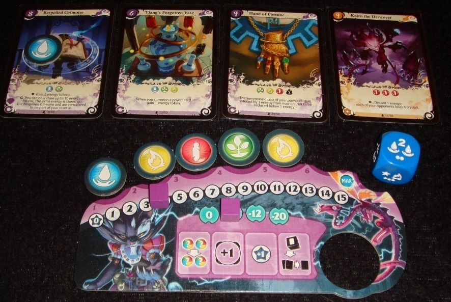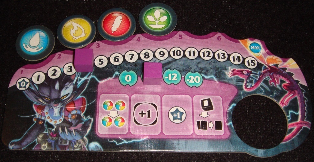 Личные планшеты игроков служат для контроля двух основных параметров могущественности колдуна – его силы и энергии. Как видно, сила магов не безгранична, так же, как и запас энергии, необходимой для активации заклинаний и призыва существ-союзников. Над планшетом в специальные круглые выемки помещаются добытые ресурсы, обычно можно хранить до 7 жетонов ресурсов, но есть карты, позволяющие превысить этот лимит. Трек, начинающийся со звёздочки, следит за тем, чтобы колдун не переборщил с заклинаниями, и его не разорвало от собственной силушки – он указывает на количество карт, которое игрок может выложить перед собой, то есть ввести в игру. Также в центре планшета находится шкала-памятка специальных действий, которые доступны игроку по ходу партии: обмен двух ресурсов, бонус к курсу во время преобразования энергии, увеличение силы на один пункт, возможность выбора карты из двух во время бонуса получения карты. За каждое использование специального действия в конце партии придётся расплатиться победными очками.