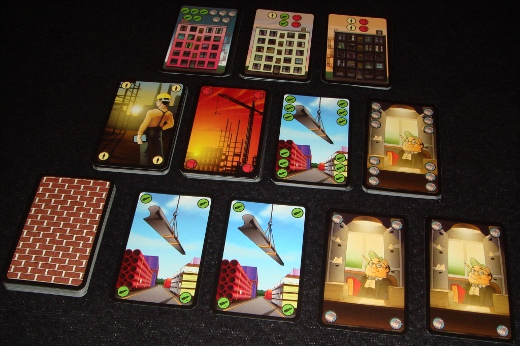Игровая колода состоит из карт зданий, обычных ресурсов и продвинутых ресурсов. Перед началом партии здания делятся на три одинаковые стопки по 7 карт и выкладываются лицом вверх.