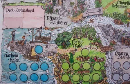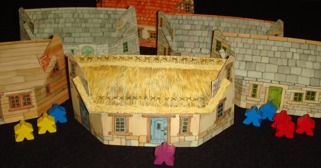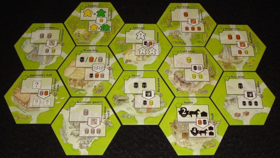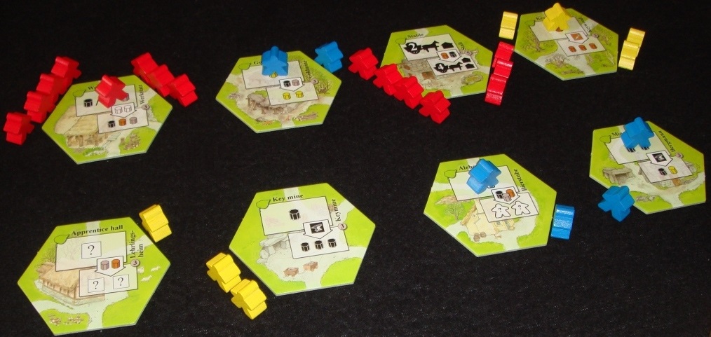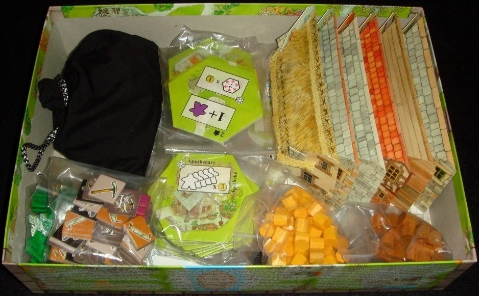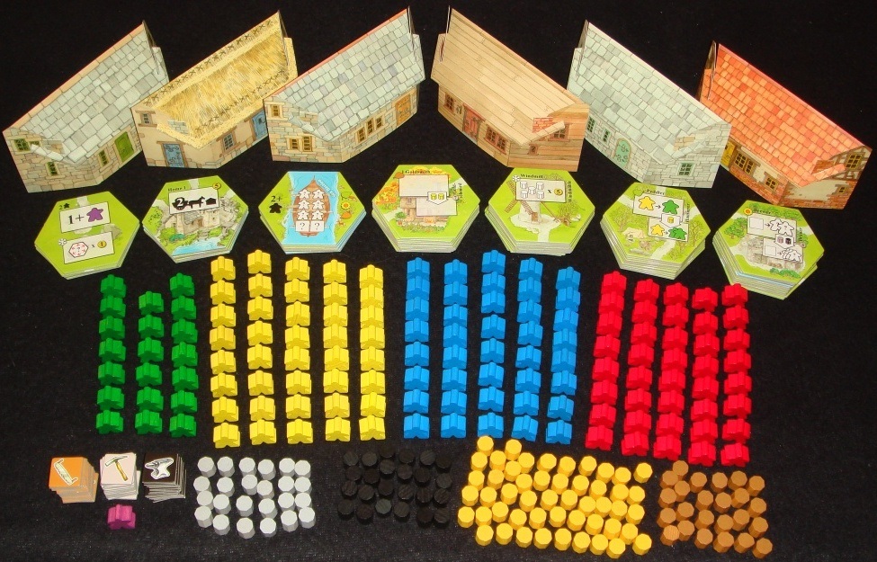 Далее игроки берут себе по понравившейся ширме и стартовому домашнему тайлу, который выкладывают перед собой. Красные, синие и жёлтые миплы идут в мешок, тщательно перемешиваются, после чего каждый тянет из него по 8 штук и, не показывая никому, прячет за ширмой. Зелёные миплы, фишки ресурсов и жетоны навыков делятся на соответствующие кучки (жетоны навыков кладутся взакрытую) – это будет общий запас.