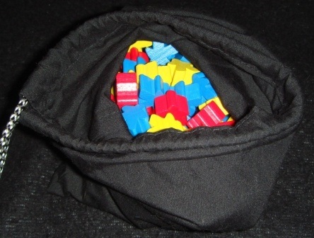 Разложив все компоненты по пакетикам и собрав ширмы, получаем коробку, плотно набитую картоном и деревом. Такое скопление каркассоновских миплов в одной игре я вижу впервые, их целый мешок или, если быть точным, 141 штука!