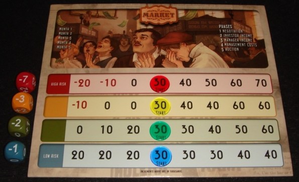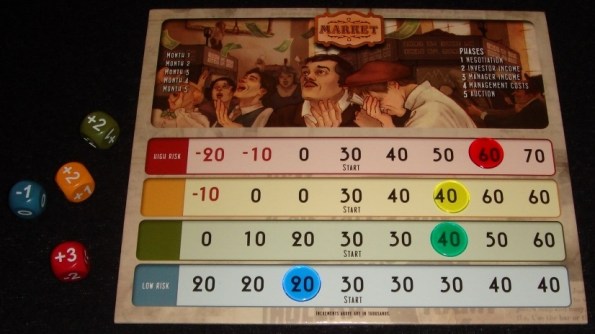 Делая предложение менеджеру, инвестор в первую очередь руководствуется текущей рыночной стоимостью акций и возможной выручкой, то есть тем, на сколько делений влево или вправо может измениться цена после броска кубиков. Так что вторая фаза – это момент истины для инвесторов. Понятно, что риски оцениваются очень легко (патигейм, всё-таки): цена красных акций за раунд может упасть на самое дно и принести владельцу ощутимый убыток, а вот у синих даже нет негативного значения цены, но на них много не заработаешь.