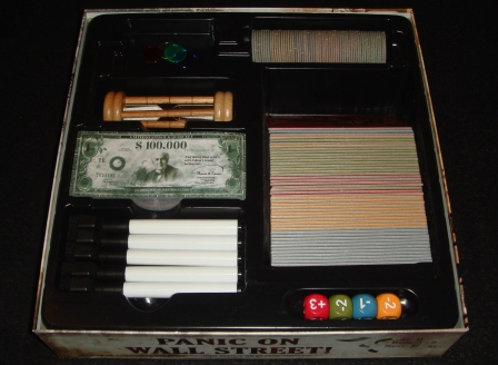 Panic on Wall Street! несмотря на серьёзное название, является патигеймом на 30 минут и поддерживает от 3 до 11 игроков. Основная механика игры – переговоры (negotiation), а тема – деловые будни инвесторов и менеджеров по продажам акций.