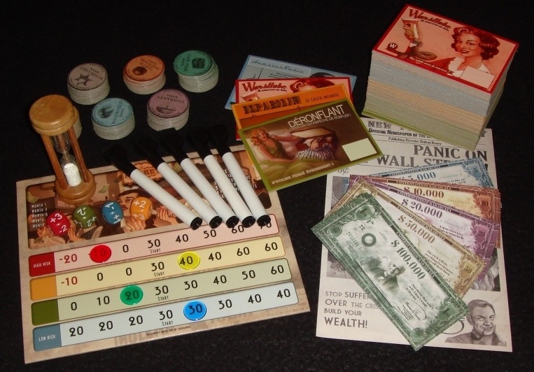 В коробке находится 1 поле рынка, 4 жетона цены из цветного прозрачного пластика, неожиданно качественные песочные часы в деревянной основе, 5 стирающихся маркеров со щёточками, 4 шестигранных кубика, 30 жетонов инвестиций, 46 глянцевых тайлов компаний (чтобы можно было стирать маркер), а также около 200 бумажных банкнот номиналом 5, 10, 20, 50 и 100 тысяч.
