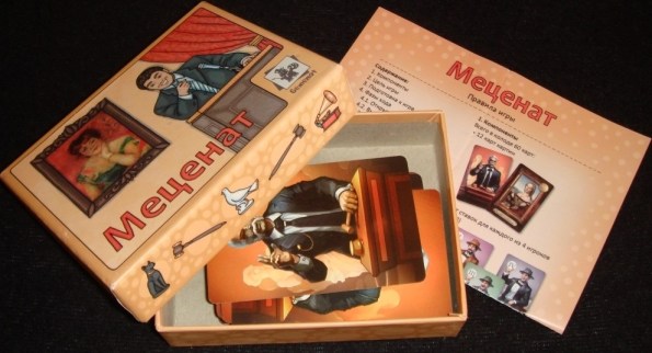Меценат (2-4 игрока). Очень простая игра, основной механикой которой является аукцион. В начале партии каждому раздаётся по одинаковому набору ставок. Набор состоит из 12 карт, из которых 10 денежных с номиналом от 10 до 150 миллионов и две специальные. В качестве лотов выступают 12 картин известных художников с победными очками. Игра делится на раунды, в каждом из которых на торги выставляется одна из картин, следовательно, всего в партии двенадцать раундов. В начале раунда из колоды картин открывается верхняя карта, после чего игроки делают на неё ставки – тайно выбирают по одной карте с руки и одновременно вскрывают. Игрок с наивысшей ставкой забирает картину себе. При равенстве ставок проходят повторные торги, но только между теми, кто сподобился сыграть одинаковые карты. Если и повторные торги не выявили победителя, то и лот, и ставки уходят в сброс. Рамки картин отличаются, и это неспроста. В Меценате присутствует и механика сбора сетов (set collection). В конкретном случае это означает, что собрав к концу партии 3 картины с одинаковой рамкой, игрок получает дополнительные 5 очков.