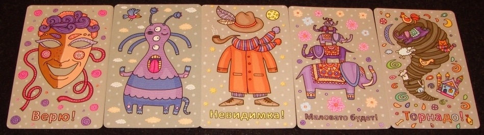 Купи слона (3-6 игроков). Компанейская игрушка на блеф. Чтобы сразу было понятно, о чём речь, следует сказать, что в её основе лежит народная забава под названием “Верю-не-верю”. Набор игры состоит тоже из 60-ти карт, 44 из которых – это карты животных (11 видов по 4 штуки), а остальные 16 – специальные. Суть игры такова. В начале партии колода тщательно перемешивается и делится поровну между игроками. После чего первый игрок выкладывает на стол от 1 до 5 карт и говорит “тут 4 зайца!”. Следующий в свою очередь может сказать “верю” и подбросить в кучу ещё карт со словами “да не вопрос, ещё 3 зайца!”, – тогда ход переходит дальше; или же не поверить и вскрыть одну из карт, выложенных предыдущим игроком. Если не угадал – хапаешь всю кучу себе, угадал – хапает тот игрок, чью карту вскрыли. Если же в любой момент игры на руках оказалось 4 одинаковых животных, то можно (и нужно) их скинуть. Есть два варианта игры: быстрый играется до тех пор, пока кто-то не избавится от всех карт, а стандартный – пока с картами не останется кто-то один.