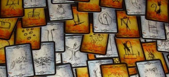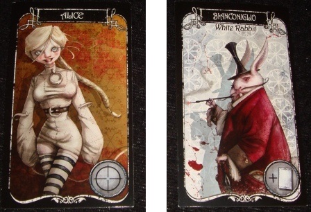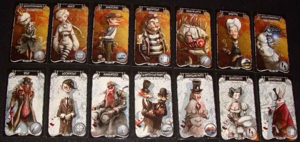 Как я уже говорил, остановившись на локации, персонаж может заняться квестом. Тут есть два варианта: первый – инициировать новый квест, поместив жетон на выбранную локацию или второй – попытаться выполнить уже существующий, при условии, что и персонаж и жетон находятся в одном месте. Другие персонажи, находящиеся поблизости, могут прервать ход игрока и, если они из той же команды, помочь ему в прохождении квеста, или, если они из противоположной, наоборот, помешать. Выполнение задания заключается в выкладывании карт с руки и повествовании связанной истории, сюжет которой основывается на картинках сыгранных карт, а концовка – на жетоне данного квеста. Выглядит это следующим образом. Например, я собираюсь пойти Алисой в лес и выполнить квест, касающийся какого-то артефакта. Сперва я сбрасываю карту, чтобы совершить движение, и поясняю, с какого перепугу Алиса туда попёрлась. Что-то вроде “Вырвавшись из лап солдат, Алиса ринулась в лес и решила там скрыться…” После этого все игроки по очереди имеют право активировать своих персонажей, прийти ко мне и так же принять участие в квесте. Затем я объявляю о начале квеста. Выложив, например, три карты с руки и поведав историю, на них основанную, я замолкаю. После этого все игроки по очереди имеют право продолжить мой рассказ, разыграв любое количество карт. Когда очередь снова доходит до меня, я завершаю повествование последней картой, при этом моя концовка должна быть связана с квестом, ради которого все собрались.