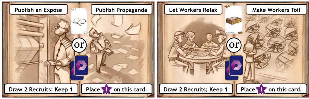 Эти два показателя отвечают за внутреннее состояние и осведомлённость рабочих. Они отмечаются на специальных треках и меняются по ходу партии при выборе определённых действий.
