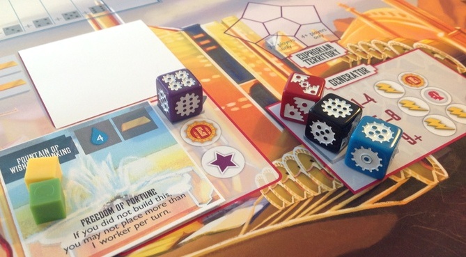 Если сравнивать Euphoria с уже существующими играми, то на ум сразу же приходит ранее упомянутая Alien Frontiers с её размещением кубиков и получением плюшек в зависимости от выпавших граней. Есть тут немного от Tzolkin и Manhattan Project, а именно две опции во время хода, когда ты можешь или расставить своих рабочих, или забрать обратно. Правда, тут это модифицировано тем, что некоторые действия позволяют “прогонять” кубики, тем самым возвращая их владельцам.