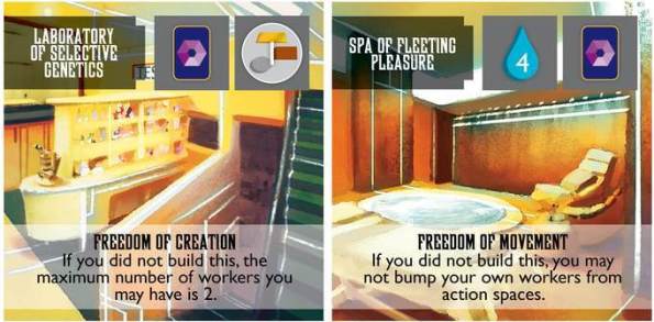 В начале партии тайлы рынков выкладываются лицом вниз, а чтобы их построить, игрокам нужно жертвовать рабочих и определённые ресурсы.