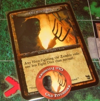 А вот у зомби дела шли как нельзя лучше. Пятёрки и шестёрки в ту ночь сыпались, как из рога изобилия. Я, как оверлорд, даже растерялся и как-то подзабыл о возможности прокачки зомбей с помощью могильного оружия. Хотя, даже при всём желании я бы не смог улучшить своих миньонов, так ка за всю партию герои убили двух или более зомби за ход лишь единожды. Так и бегал один мой бедолага с вилами, которые он нашёл с помощью карты событий, пока сам на них не наткнулся.