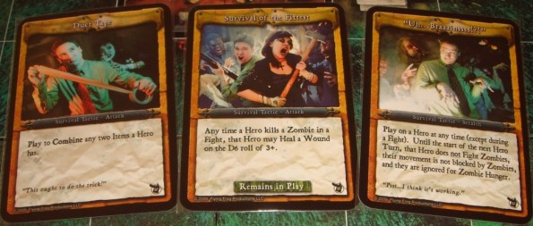 Основа Survival of the Fittest – это три новые колоды по 20 карт в каждой: уникальные предметы и карты тактики выживания – для героев, и орудия из могил – для зомби. По сути, перед нами те же самые карты hero и zombie дека, только более мощные и с иным способом получения. К слову, обычные карты тут тоже идут в комплекте, 8 к колоде героев и 8 – к зомби.