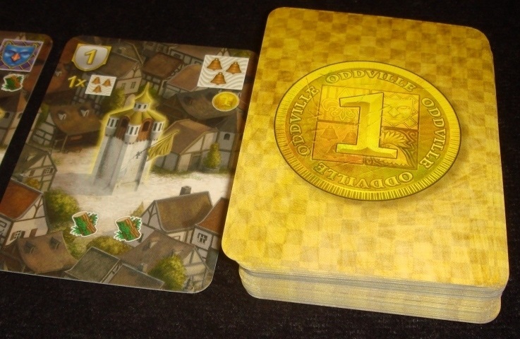 Интересно, что поле ресурсов является поставщиком этих самых ресурсов только первые несколько раундов. Потом большая часть материалов добывается за счёт правильной пристройки зданий. Можно даже сказать, что это вынужденная мера, так как с расширением карточного городка, фишки будут постепенно заселять OddVille, и чтобы компенсировать недостаток рабочей силы на карьерах, потребуются “дорожные” бонусы. Вообще, иногда лучше построить менее привлекательное здание за счёт другого, но сразу же. Тем самым можно не только усилять свои собственные комбинации на победные очки, но и, обладая несколькими картами гильдий, быстренько завершить партию в свою пользу, не дав соперникам опомниться.