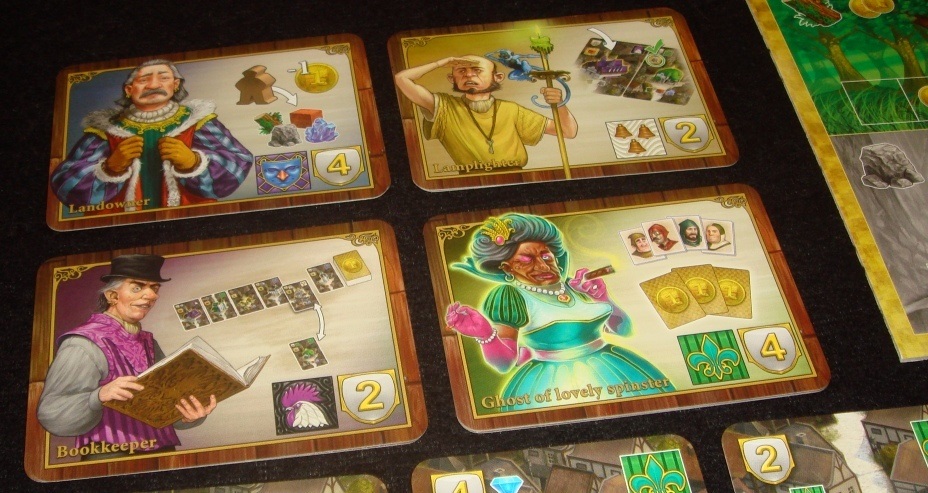 Все персонажи, представляющие гильдии, уникальны, то есть, повторяющихся свойств нет. Например: с помещиком при добыче ресурсов можно платить на монету меньше, жулик даёт возможность каждый ход переворачивать монету и тем самым превращать её в готовый проект, меценат в начале хода приносит по одной дополнительной монете, а фонарщик во время строительства позволяет получать бонусы всех смежных зданий, а не только тех, что соединены дорогами.