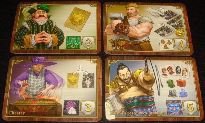 Всего у игрока четыре карты рабочих, и между собой они отличаются лишь силой эффекта. Разыгранная карта откладывается, и в ближайших раундах выбирать её уже нельзя. Вернуть карты можно бесплатно – после того, как был разыгран последний рабочий, или за деньги – уплатив столько монет, сколько карт рабочих осталось в руке.