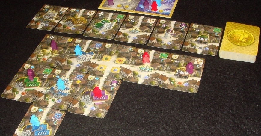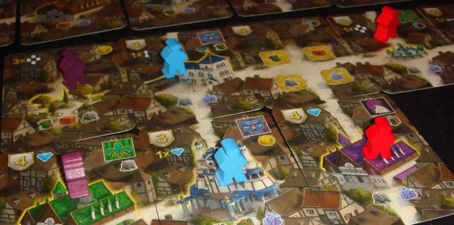 Отправной точкой расширения города является главная площадь. При строительстве следует соблюдать два основных принципа: 1) на север расширяться нельзя; 2) новая постройка должна касаться любой ранее выложенной хотя бы одной стороной, при этом картинки смежных карт должны совпадать (дорога – к дороге, дома – к домам). Пристроенное здание игрок помечает своей фишкой, после чего получает бонус, указанный в верхнем правом углу карты, а также бонусы всех рядом стоящих зданий, с которыми оно соединено дорогами. Награда в основном касается ресурсов, изредка можно получить монеты.