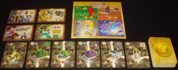 В начале партии каждому игроку выдаётся по 4 карты рабочих и 9 миплов своего цвета. Миплы тут выступают в несколько непривычном амплуа, они просто являются маркерами принадлежности ресурса или здания. Далее на стол помещается поле ресурсов, а под ним из карт построек формируется рынок: вскрывается 6 карт и кладётся рядом с колодой. Карты гильдий разделяются по типам на 4 стоки, после чего стопки перемешиваются и располагаются лицом вверх рядом с полем ресурсов.