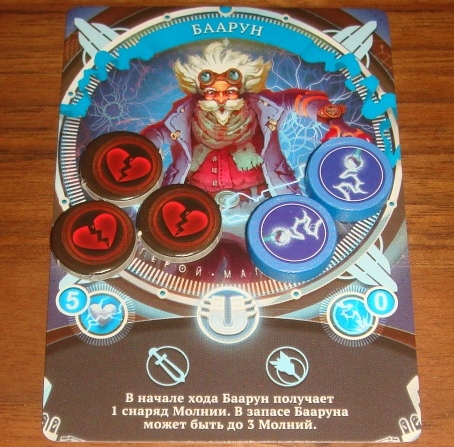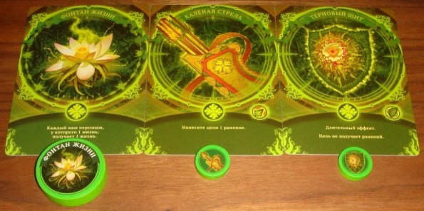 Герои – самые “жирные” персонажи, они имеют 5-6 жизней (ранения отмечаются жетонами, которые кладутся на карточку), ветераны послабее – у них всего две жизни (ранения отмечаются переворотом диска на сторону с капелькой), а бойцы являются пушечным мясом, запас здоровья у них равен единице.