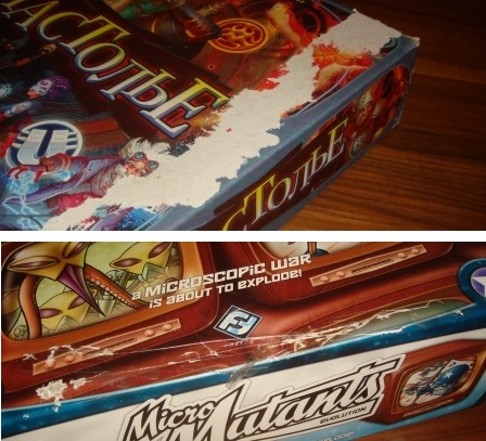 Настолье пришло курьерами DPD, которые додумались своим крепким скотчем приклеить документы просто на коробку (например, FedEx и UPS посылку сперва кладут в плотный мешок и клеят уже поверх него). А Мутантам вероятно досталось от работников магазина, решившим тоже скотчем “починить” надорванную плёнку. В общем, без комментариев, давайте-ка, я лучше расскажу про игры.