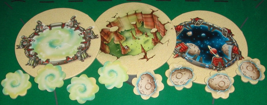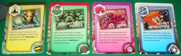 В начале партии жетоны ресурсов разбрасываются в центре стола, а подобрать их можно обычным “накрытием”. За два ресурса малую базу можно улучшить до большой и сразу же разыграть одну из карт эволюции. Эти карты дают постоянные бонусы своей армии.