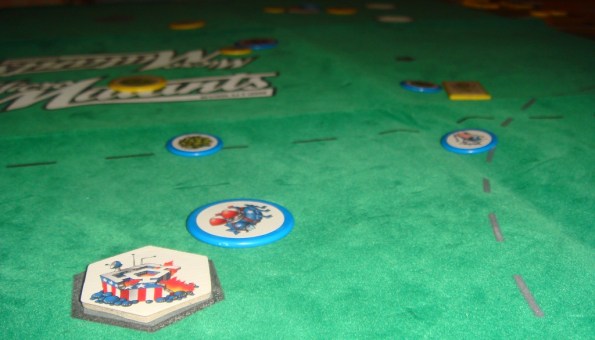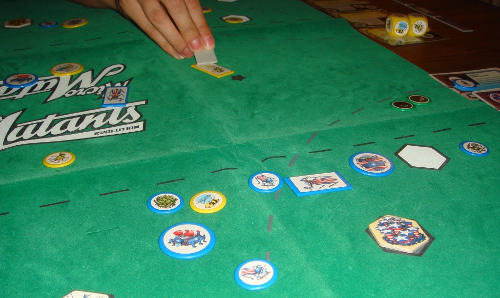 А вот в Мутантах мы уже ввели хоумрул, который я назвал “Камикадзе”. Он, кстати, отлично вписался в тематику игры. Смысл в том, что, укусив базу, жук тут же погибает и уходит в запас. Это позволяет избежать ситуаций лёгкой наживы, когда, нанеся базе первое ранение, диск остаётся лежать рядом с ней, и в следующий ход без проблем её добивает.
