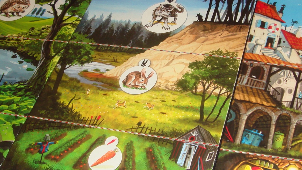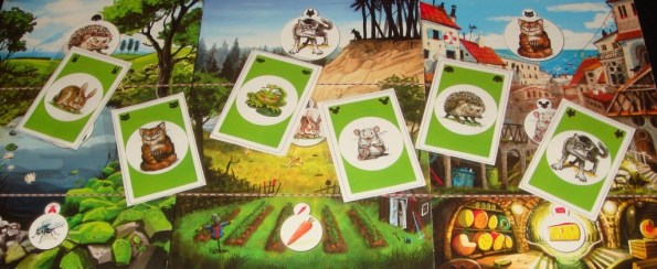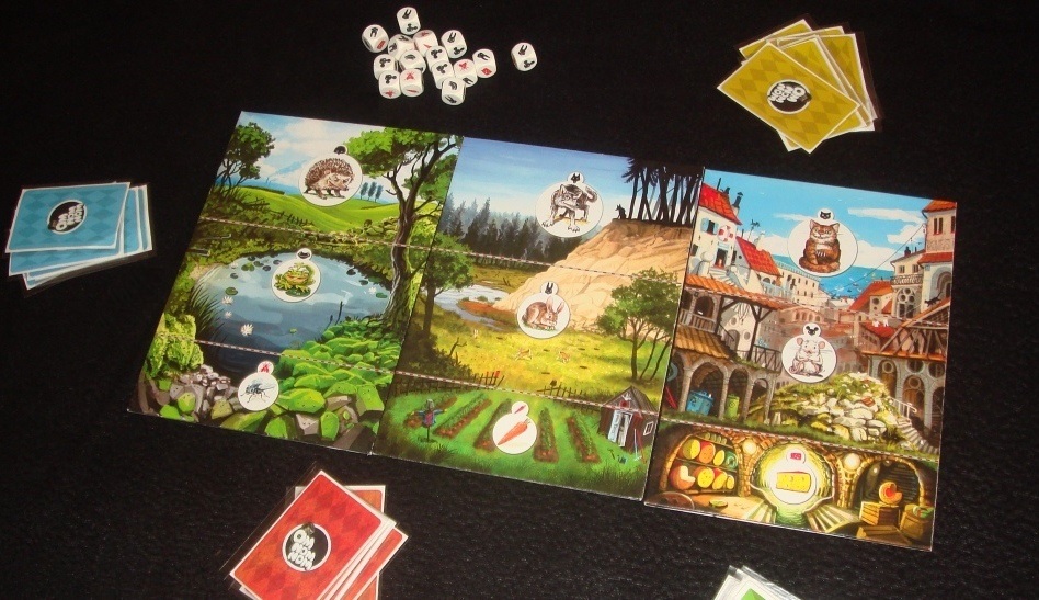 Партия начинается с того, что в центр стола помещаются три игровых поля, иллюстрирующих простейшие и всем знакомые пищевые цепочки: волк-заяц-морковка, кот-мышка-сыр и ёжик-лягушка-муха. Последняя, конечно, не такая популярная.