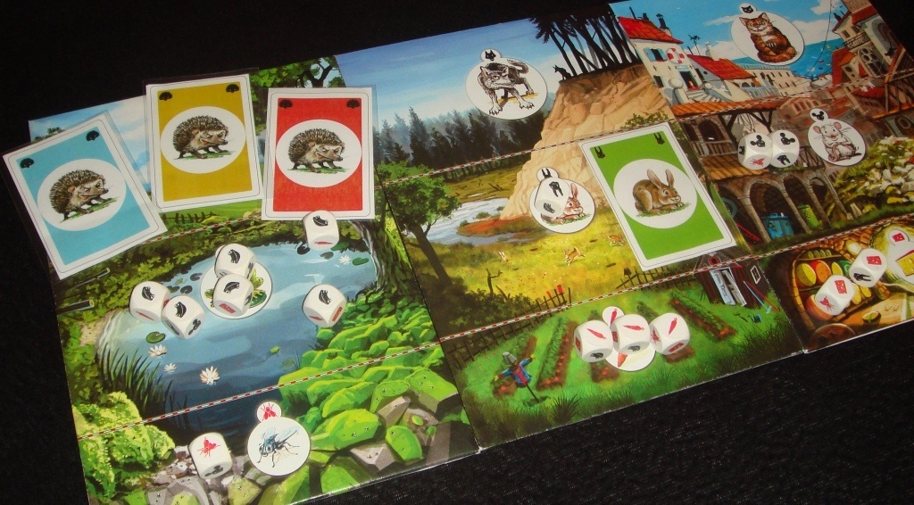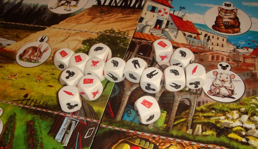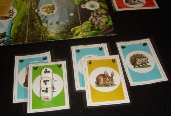 Последний штрих – игровые кубики, они кладутся рядом с полями и ждут своего часа. На их гранях изображена добыча – животные со средних уровней полей и лакомство с нижних.