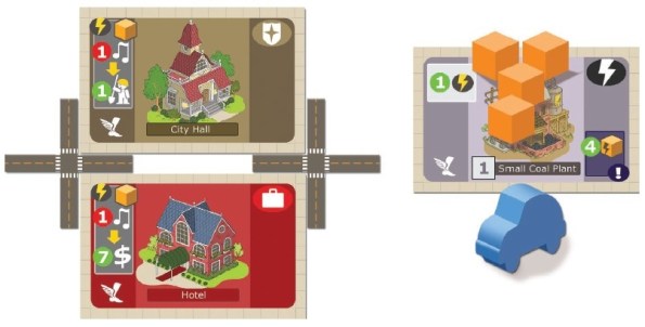 Каждый игрок начинает партию с фишкой туристов и тремя уже готовыми постройками: дешёвым отелем, городской администрацией и заводом первого уровня. Отель и администрация “скрепляются” специальными крестообразными жетонами, а завод кладётся отдельно и сразу же вырабатывает четыре энергии.