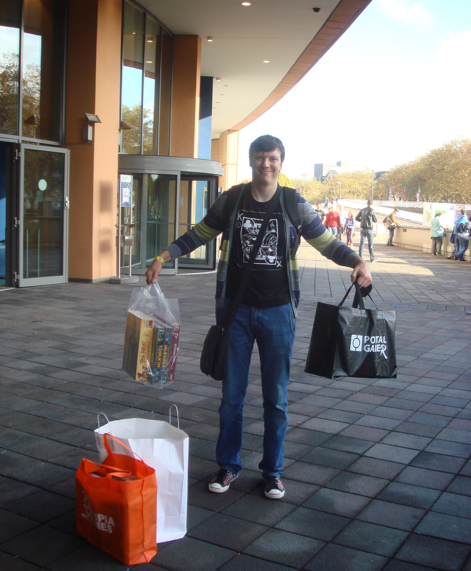 А это уже я довольный с мешками игр после 36 минут выставки (специально посмотрел). Собрал все предзаказы и must have, так что, в принципе, мог уже ехать домой. Это я к тому, что если у вас мало времени или вы проездом, то в первые часа два можно спокойно и без паники купить то, что вас интересует, так как народ ещё только подтягивается, а детей и вовсе нет, будни ведь.