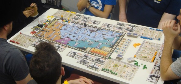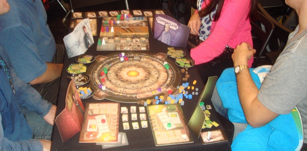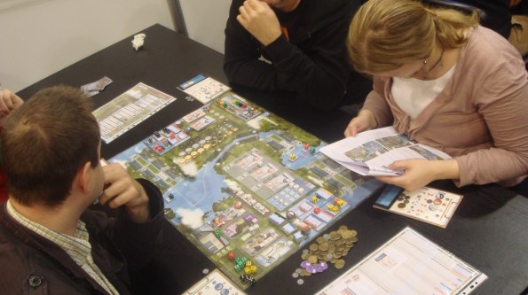 Тут наши друзья Ричийс и Лаура, с которыми мы приехали на выставку, пробуют Rockwell, игру про нелёгкие будни руководителей компаний по добыче ресурсов из недр нашей матушки Земли.