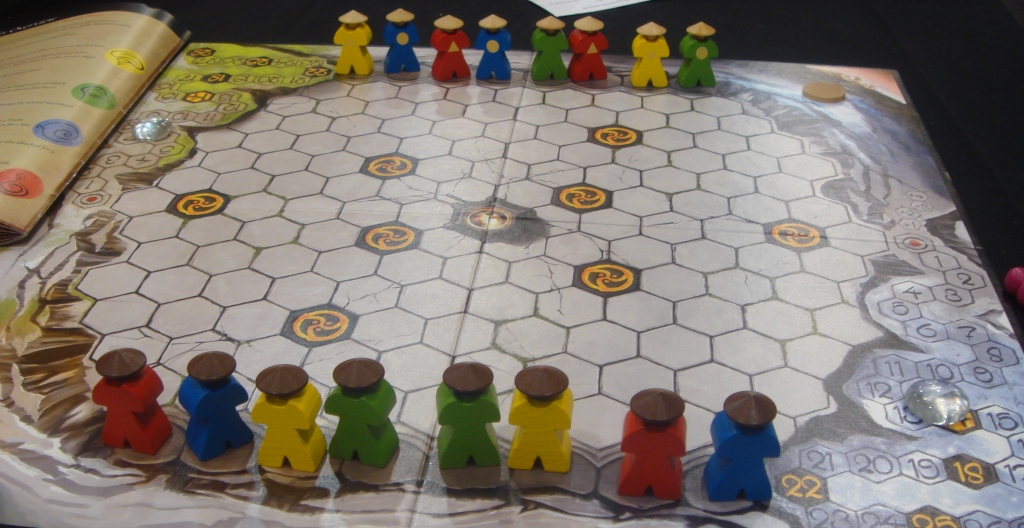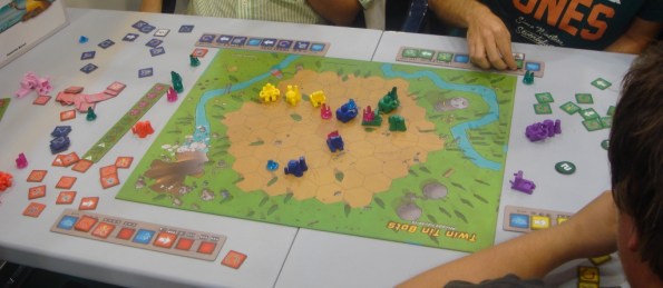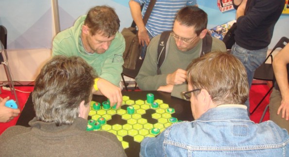 На стенде компании Blue Orange популярностью пользовались абстрактные Battle Sheep и Longhorn. Первая – на перемещение стопок дисков по гексовому полю. Двигаться разрешено только по прямой и, уходя с места, на нём следует оставить как минумум один диск. По ходу партии стопки с дисками-овечками будут “таять”, пока кто-то не сможет сделать ход и, следовательно, проиграет.