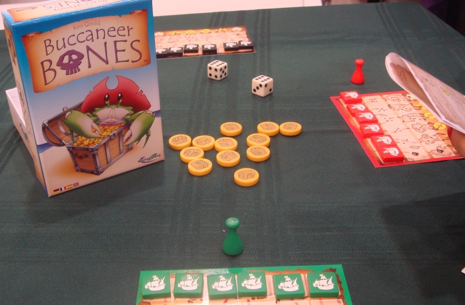 Ещё один “плод” Кисктартера – Buccaneer Bones. Вообще, на выставке я поставил себе цель найти какой-нибудь прикольный филлер на кубиках. Испробовали мы с Катей таких филлеров достаточно и после череды разочарований нашли-таки один, правда, не совсем филлер. А начали мы с вот этого, не побоюсь этого слова, убожества. В Buccaneer Bones не надо принимать никаких решений, ты просто кидаешь кубики и на дубли двигаешь к сокровищам соответствующие фишки кораблей. Не выкинул дубль, ничего, повезёт в другой раз!