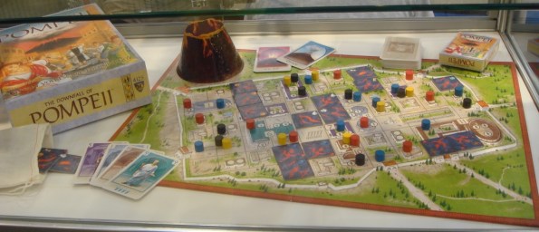 Одно из приобретений – The Downfall of Pompeii, репринт игры 2004 года. Довольно приятная штука: в первой части игры с помощью карт с цифрами все расставляют свои фишки по зданиям, а во второй, после извержения вулкана, размещают тайлы лавы и стараются вывести своих подопечных из города (пока тех не накрыло). Есть где подумать и в то же время играется быстро и непринуждённо, особенно приятно закидывать фишки соперников в вулкан.