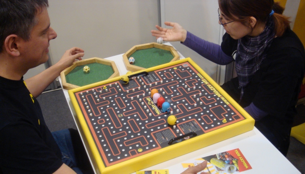 Настольный Pac Man. Фигуры двигаются по велению кубиков, кинь-двинь, в общем. Понравилось то, что поедание точек Пакманом помечается вдавливанием торчащих из поля палочек.