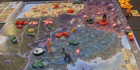 Трудно сказать, на какую целевую аудиторию рассчитан Triassic Terror. Вроде бы серьёзная игра на контроль территорий, но оформление и компоненты… Резиновые фигурки динозавров прямиком и детских наборов с конфетками.